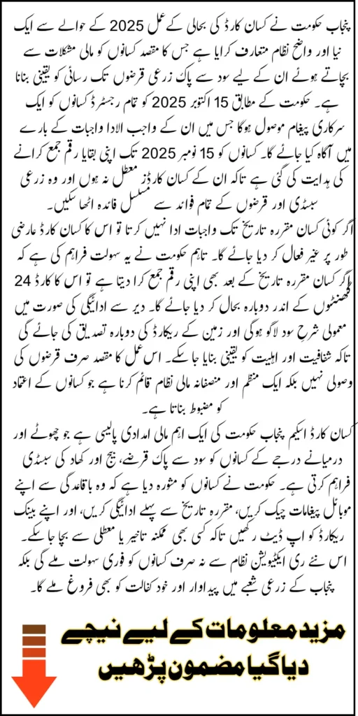 Under the new system, card reactivation can be completed within 24 hours, making it faster and more efficient than before. The government’s goal is to provide uninterrupted financial support to farmers across Punjab, promoting timely cultivation and improved crop yields. The updated process not only simplifies reactivation but also safeguards future eligibility for ongoing agricultural schemes and loan programs, ensuring that no eligible farmer is left behind in the province’s journey toward sustainable agricultural growth.