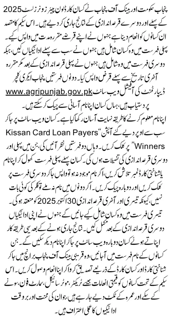 The Kissan Card Loan Payers Winners List 2025 is a milestone program by the Punjab Government to recognize the efforts of hardworking farmers who meet their financial obligations on time. With the first and second draw lists already published and the final draw set for 30 October 2025, now is the time for all farmers to check their names online and be ready for prize collection.