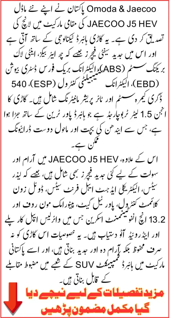 The launch of the JAECOO J5 HEV by Omoda & Jaecoo Pakistan reflects a strategic move to expand its portfolio and cater to the rising demand for hybrid SUVs. With its combination of safety, comfort, technology, and hybrid efficiency, it promises to set a benchmark in the compact SUV segment.