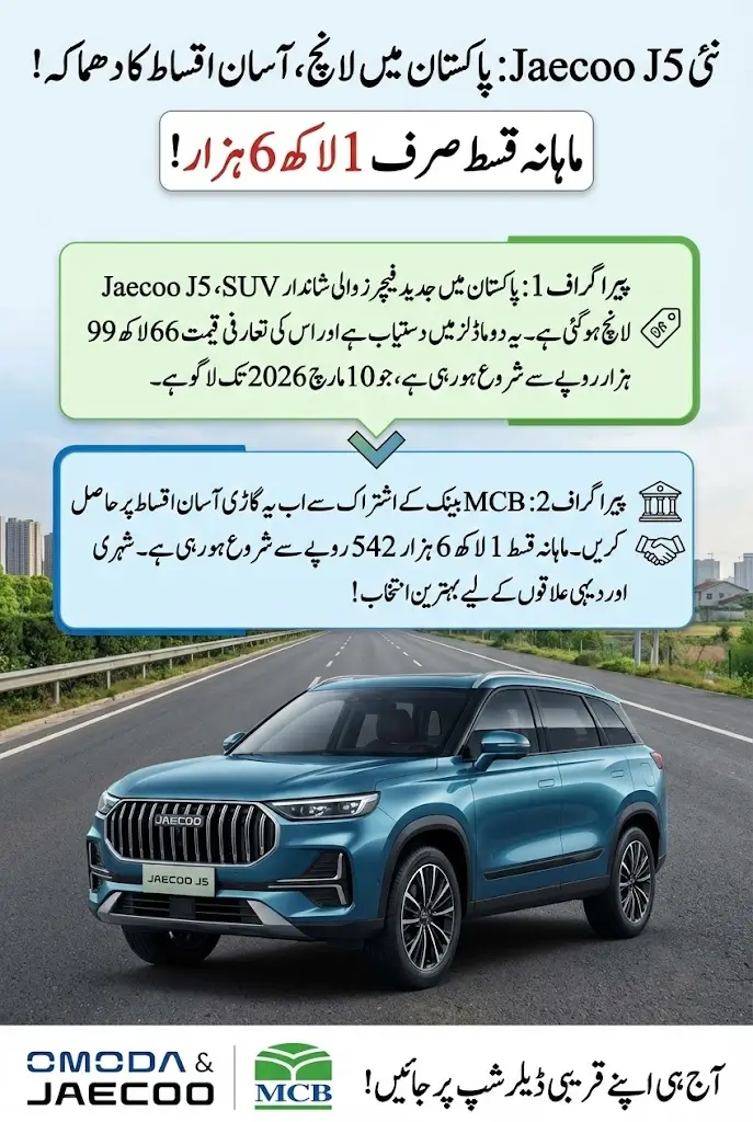 The combination of affordability, features, and financing convenience positions the Jaecoo J5 as a strong competitor in Pakistan’s compact SUV market.