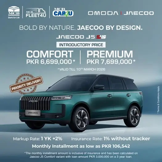 MCB Bank has partnered with Omoda & Jaecoo to provide flexible financing options for the Jaecoo J5. Buyers can select a suitable plan depending on their financial capacity and loan tenure.