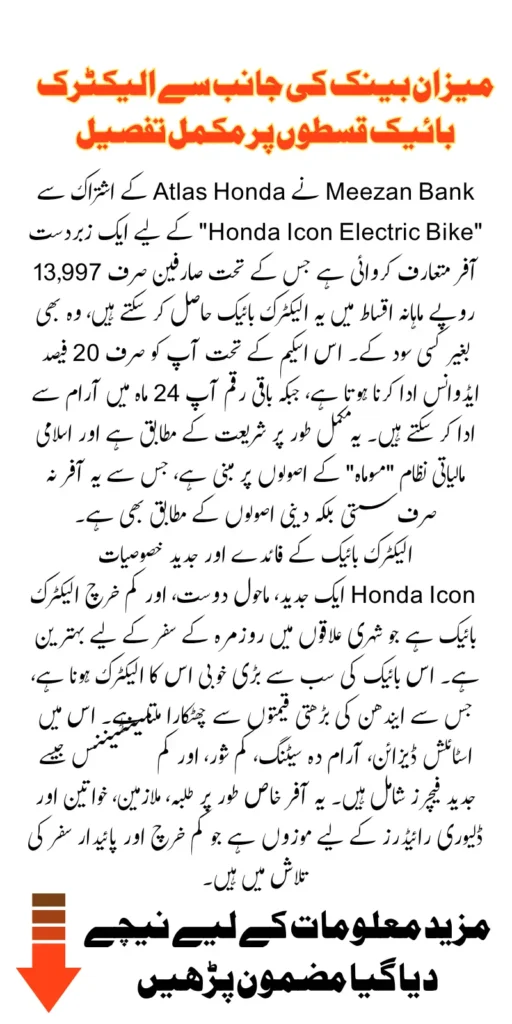 Meezan Bank Offering Honda E-Bike On Rs. 13997: Meezan Bank, in collaboration with Atlas Honda, has launched an exciting offer that brings electric mobility within the reach of thousands of Pakistanis. For the first time, customers can now avail the stylish and eco-friendly Honda Icon Electric Bike on easy monthly installments. This offer is not only budget-friendly but also completely Shariah-compliant under the Islamic financing model of Musawamah.