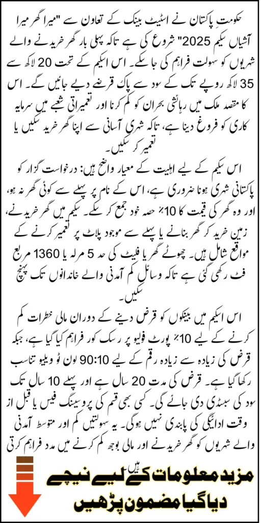 Mera Ghar Mera Ashiana Scheme 2025: The Government of Pakistan, in collaboration with the State Bank of Pakistan, has introduced an ambitious initiative called the Mera Ghar Mera Ashiana Scheme 2025. This scheme is designed to make homeownership accessible for first-time buyers by offering interest-free home loans ranging from 20 to 35 lakh. The initiative aims to address the housing shortage in the country while supporting economic growth by encouraging investment in the housing sector. The scheme is tailored to help citizens purchase, construct, or expand housing units while keeping financial burdens manageable.