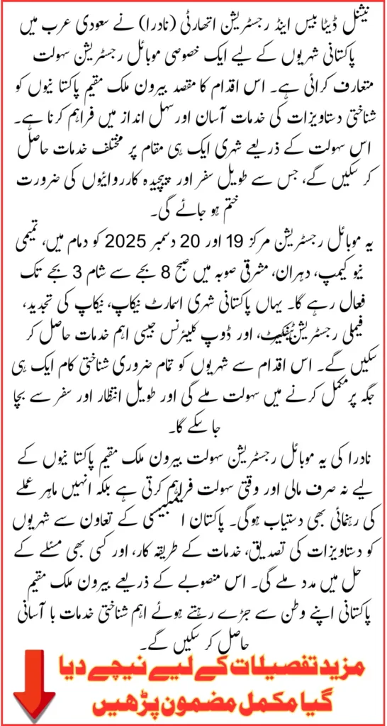 NADRA Launches Special Registration Facility In Saudi Arabia: The National Database and Registration Authority (NADRA) has launched a special mobile registration facility in Saudi Arabia to provide convenient identity services for Pakistani citizens living abroad. This initiative, in collaboration with the Pakistan Embassy, aims to make essential documentation more accessible and reduce the travel and administrative burden for overseas Pakistanis. By setting up a mobile service center, NADRA ensures that important identity-related services can be completed efficiently at a single location. (Source: Propakistani.pk)
