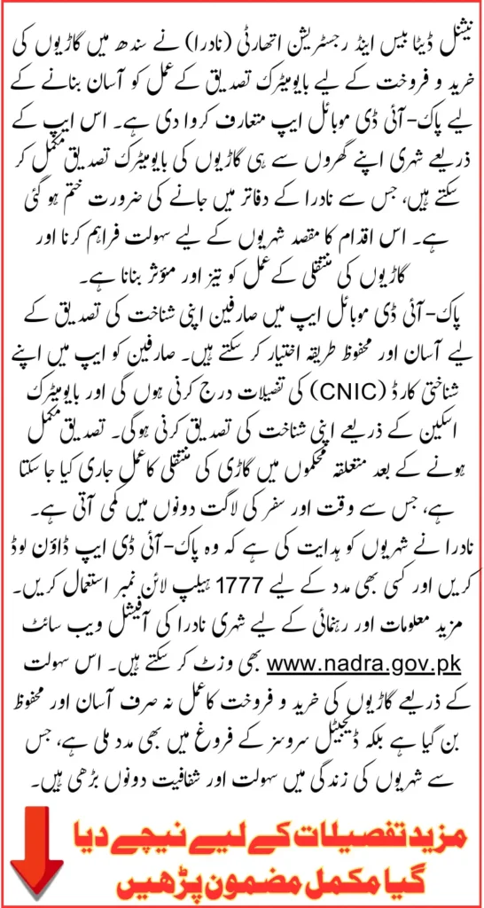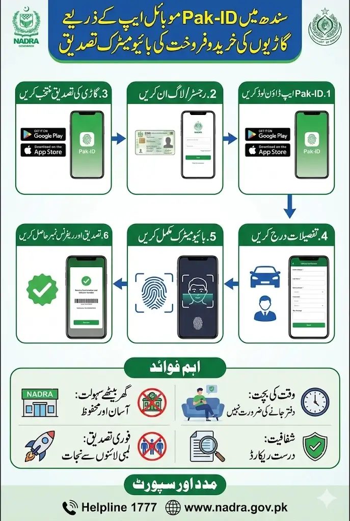 Vehicle Sale and Purchase Biometric Verification: The National Database and Registration Authority (NADRA) has introduced a streamlined process for vehicle sale and purchase verification in Sindh through the Pak-ID mobile application. This initiative allows citizens to complete biometric verification remotely, eliminating the need to visit NADRA offices physically. By adopting mobile verification, the authority aims to simplify vehicle transactions, save time, and make the process more convenient for the public.