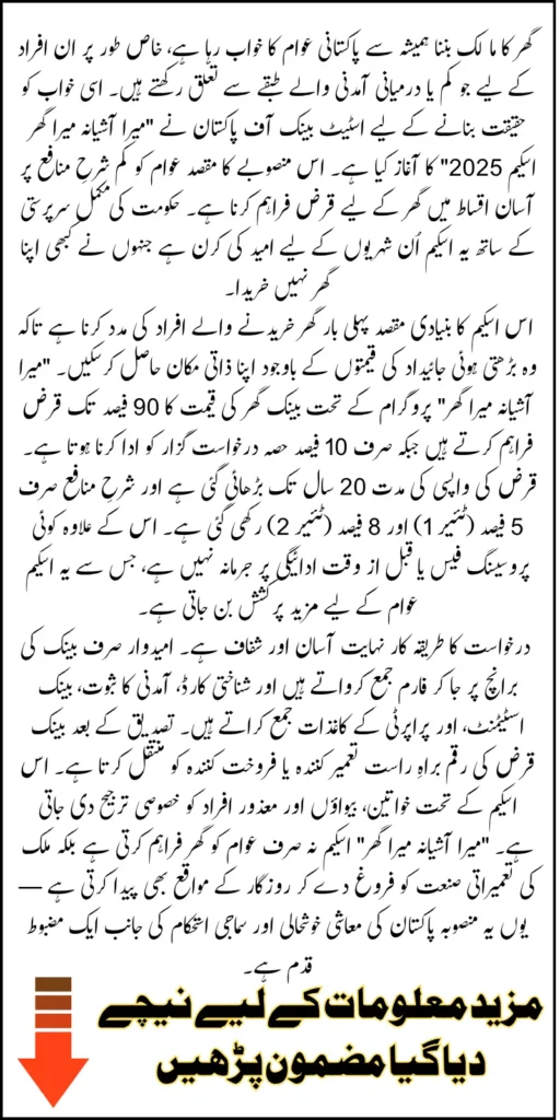 The State Bank of Pakistan’s Mera Ashiana Mera Ghar Loan Scheme 2025 is a milestone in making housing accessible to everyone. It not only provides financial relief to the underprivileged but also strengthens Pakistan’s housing and construction sector.