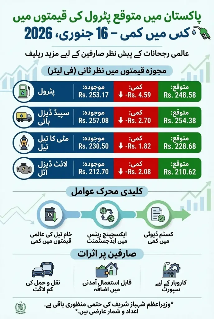 Petrol Price Expected To Drop Again On 16 January: Consumers in Pakistan are set to receive further relief at the pump as petroleum product prices are expected to be reduced again starting January 16, 2026. This follows a significant price cut at the beginning of the new year, offering much-needed financial respite to the public. The proposed price revision is part of a broader review of global oil trends and domestic economic indicators by the federal government.