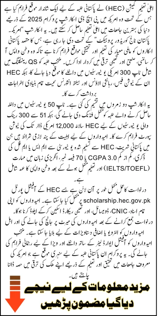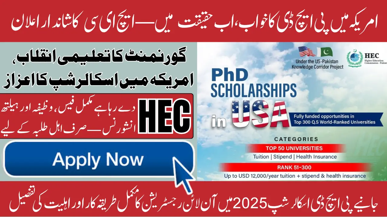 PhD Scholarship Program In the USA 2025: The Higher Education Commission of Pakistan has announced a remarkable opportunity for Pakistani scholars who dream of pursuing their PhD studies in the United States. Under the US–US-Pakistan Knowledge Corridor Project, the PhD Scholarship in USA Program 2025 offers fully funded scholarships at the world’s top universities. This program aims to prepare highly qualified researchers who can contribute to Pakistan’s academic, scientific, and industrial growth.