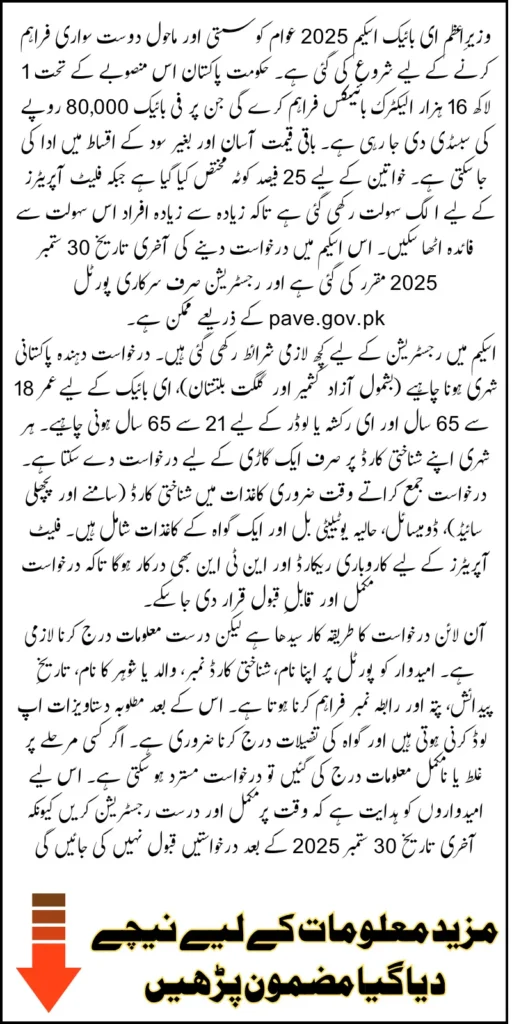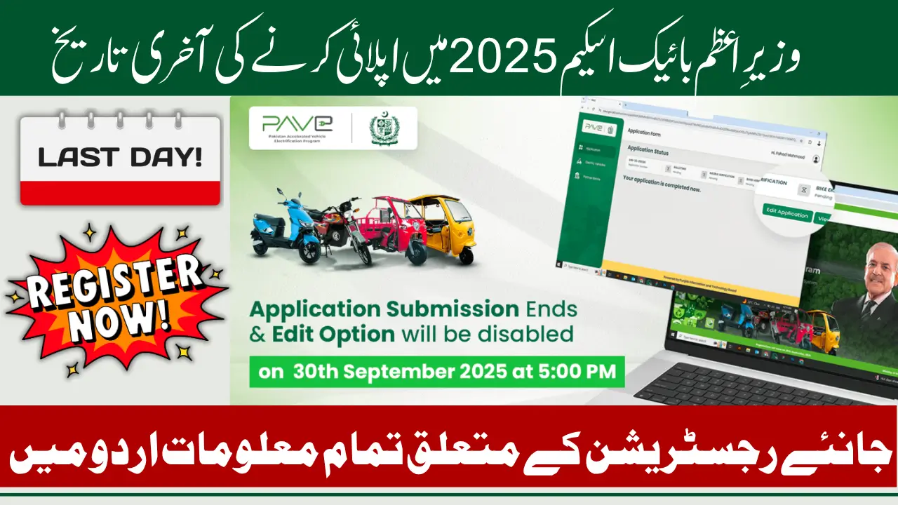 PM E-Bike Scheme Registration Closing Today: The Government of Pakistan has introduced the PM E-Bike Scheme 2025 to promote green and affordable transport for the public. With the rise in fuel prices and the growing need for sustainable alternatives, this program makes electric bikes and other eco-friendly vehicles accessible to people at affordable costs. Registration is available through the official portal pave.gov.pk, and today is the final chance to apply before the window closes.