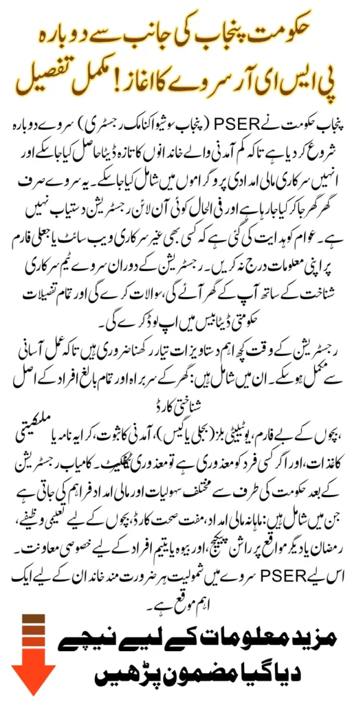 PSER Survey Registration: The Government of Punjab has officially restarted the PSER Punjab Socio-Economic Registry survey to collect updated household data for eligibility assessment in various financial aid programs. This fresh round of registration gives eligible families another opportunity to get included in official welfare schemes. Whether you were missed in the previous round or have had changes in your household data, this door-to-door verification campaign is crucial.