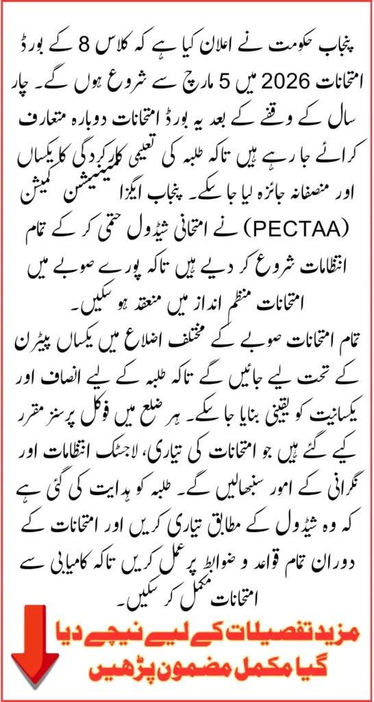 The restoration of Class 8 board exams in Punjab reflects the province’s commitment to enhancing academic standards and ensuring fair evaluation. The schedule starting from March 5, 2026, provides students, teachers, and parents with sufficient time for preparation and organization.