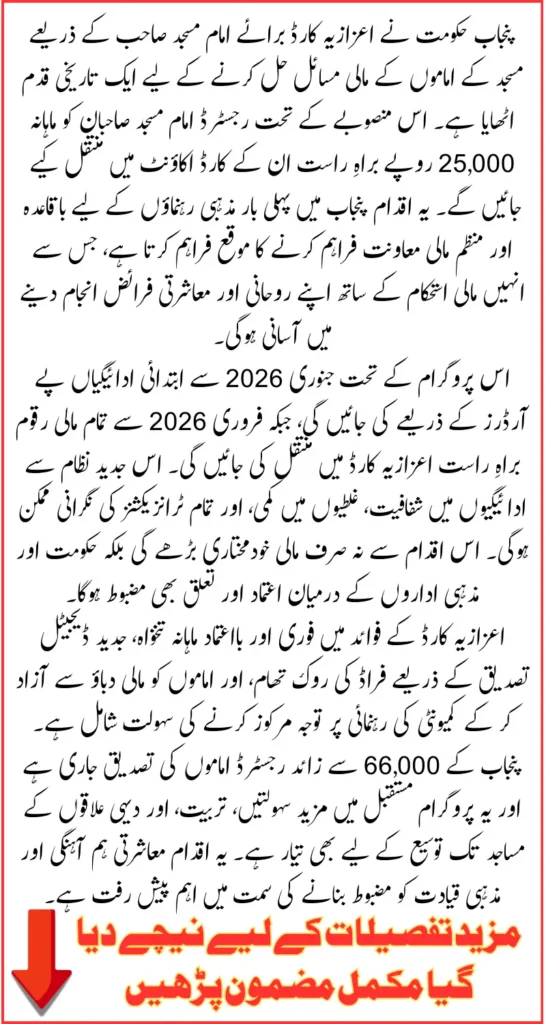 The Honorary Card program will not only provide imams with a reliable source of income but will also simplify administrative processes and reduce errors in financial transactions. Starting January 1, 2026, the first payments will be distributed via pay orders, and from February 1, 2026, all payments will be processed directly into the Honorary Card accounts. This initiative highlights the Punjab government’s commitment to modern governance, organized welfare, and community support.