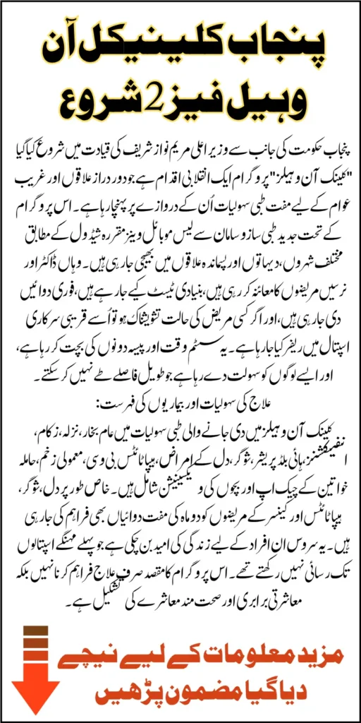 Punjab Clinical On Wheel Phase 2: The Punjab government, under the leadership of Chief Minister Maryam Nawaz Sharif, has launched the second phase of the Clinics on Wheels program. This project is meant to take healthcare services directly to people’s homes, especially for those living in poor or remote areas where hospitals are far away.