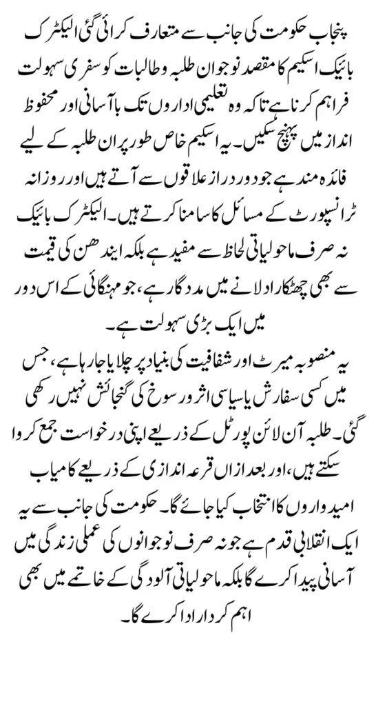 This initiative reflects the Punjab government’s strong commitment to youth welfare and sustainable mobility. The scheme is a subsidy-based program that enables students to receive electric bikes on a convenient installment basis. The primary goal is to offer a reliable and cost-effective travel option for students, helping them reach their educational institutions without the financial stress of fuel expenses or transport fares. The use of electric bikes not only supports students but also contributes to reducing air pollution and traffic congestion in urban areas.