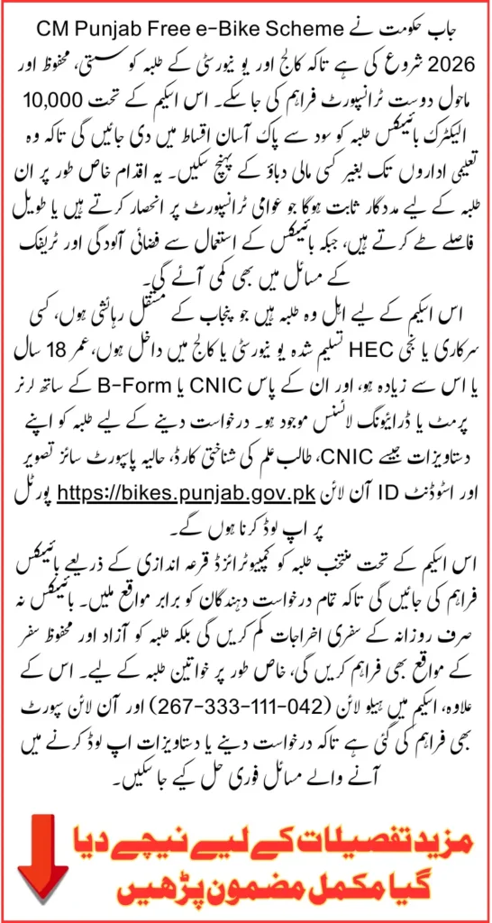 Punjab CM Free e Bike Scheme Government of Punjab, under the leadership of Chief Minister Maryam Nawaz, has taken a major step toward empowering the youth by launching the Punjab CM Free e-Bike Scheme 2026. This program is specifically designed to benefit college and university students by providing them with environment-friendly electric bikes. With an aim to reduce transport problems, save commuting costs, and promote green energy, this initiative has received overwhelming attention across the province.
