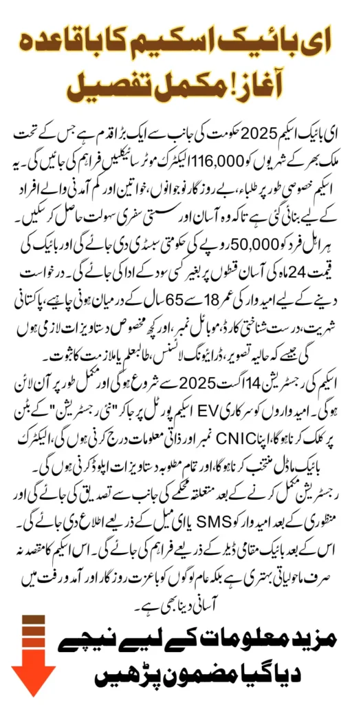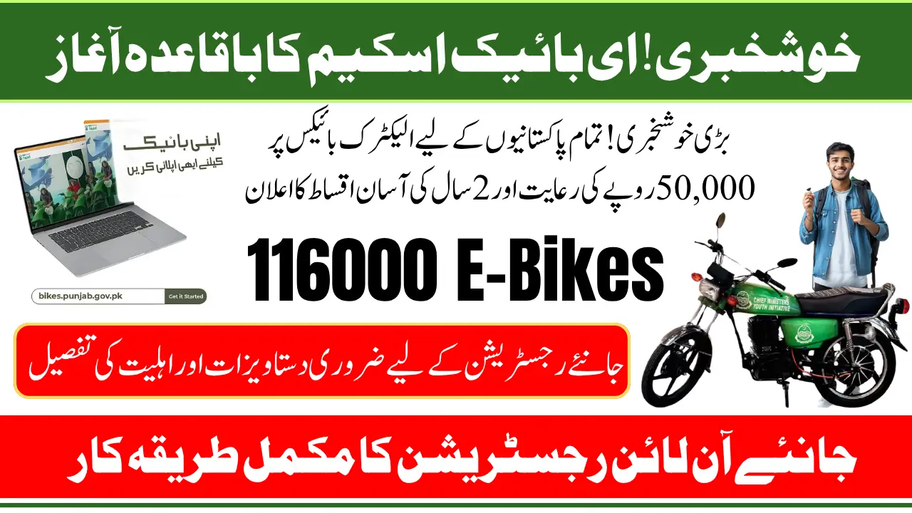 Punjab E-Bike Scheme 2025: The Government has announced the E‑Bike Scheme 2025, a forward-thinking initiative to provide 116,000 electric motorcycles to citizens across the country. These bikes will be distributed through a zero-interest, 24-month installment plan, with each recipient benefiting from a substantial 50,000 government subsidy. While the scheme is announced by the Punjab Government, it will be implemented nationwide. This is part of the government’s larger vision under the Electric Vehicle Policy to reduce environmental impact and improve transportation access for low and middle-income groups.