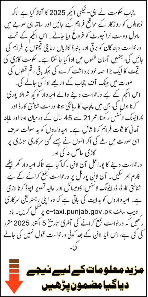 Punjab E-Taxi Scheme 2025 Deadline: The Punjab E-Taxi Scheme 2025 is an innovative initiative by the Punjab government to promote green transportation while helping individuals start their own taxi business. This scheme provides substantial subsidies and flexible installment plans for purchasing electric or hybrid taxis. If you are planning to apply, it is crucial to complete your registration before the final deadline. Missing this date will make you ineligible for the benefits, and no applications will be entertained afterward.