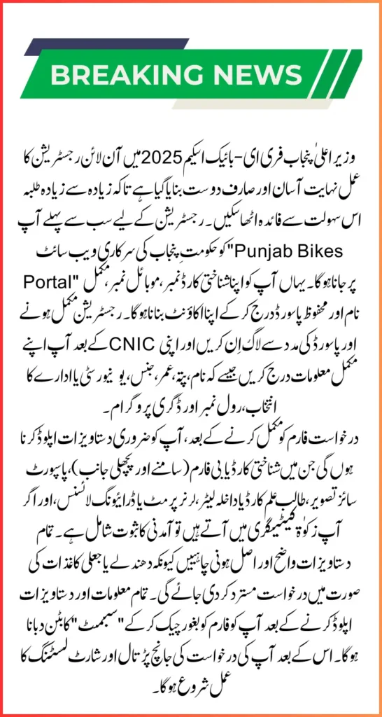 The scheme is being executed through the official portal: https://bikes.punjab.gov.pk, where students can register online and track their application status.