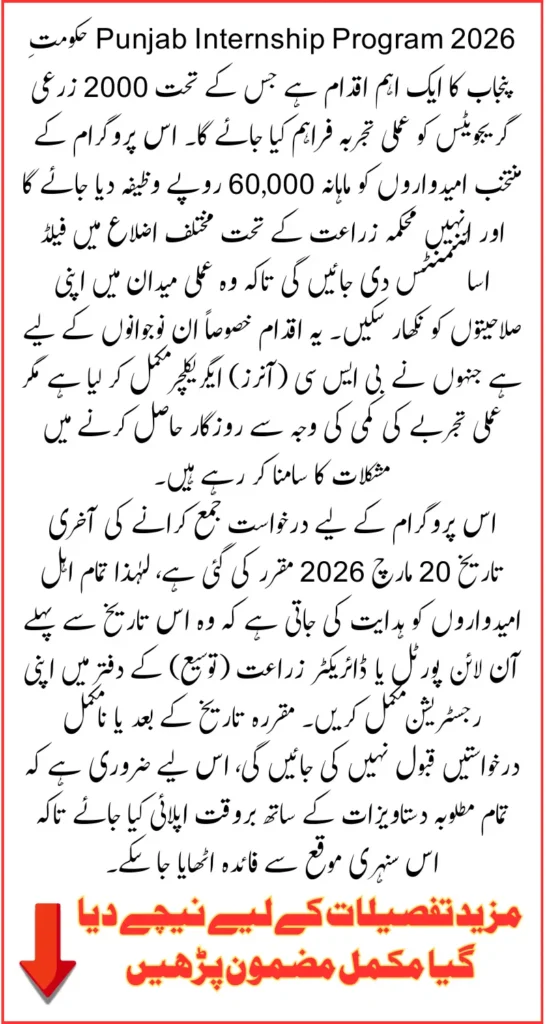 Punjab Internship Program 2026 Deadline: The Government of Punjab has introduced an excellent opportunity for young agriculture graduates under the Punjab Internship Program 2026. This initiative is designed to provide valuable work experience to 2000 qualified individuals in the agricultural sector. With the goal of empowering the youth and improving their employability, the program promises a monthly stipend of Rs. 60,000.