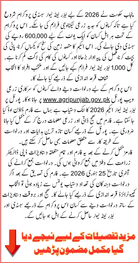 The Punjab Laser Land Leveler Subsidy Program 2026 is an important step toward modernizing agriculture and improving efficiency. Farmers who participate in this scheme can benefit from advanced technology, save water, reduce operational costs, and increase crop yields.