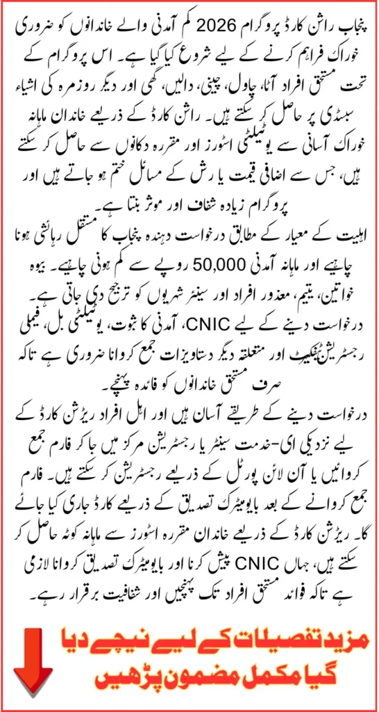 The Punjab Ration Card Program 2026 is a powerful step by the provincial government to address the urgent issue of food insecurity among low-income households. By setting clear eligibility criteria, simplifying the registration process, and ensuring transparency through digital verification, the program promises to deliver targeted relief to those who need it most. Families will not only gain access to subsidized food items but also experience dignity and respect while collecting their rations.