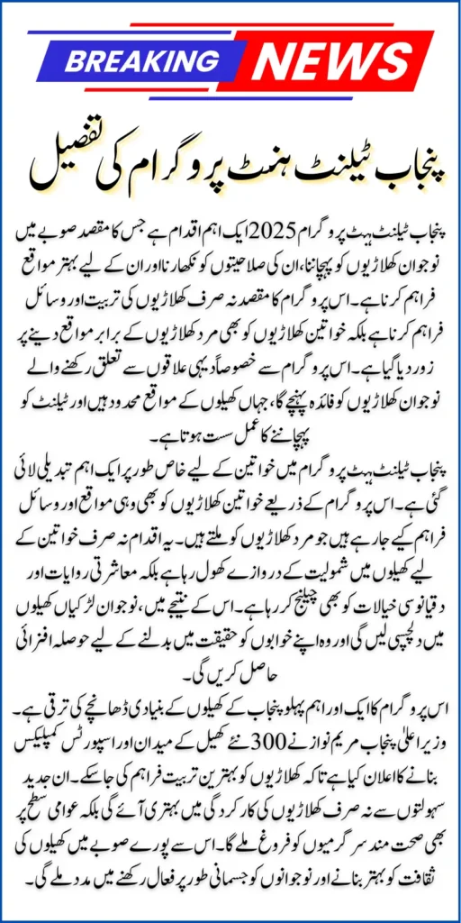 The Punjab Talent Hunt Programme 2025, launched by Chief Minister Maryam Nawaz, is a pioneering initiative aimed at discovering and nurturing young sports talent across the province. Its goal is to provide equal opportunities for male and female athletes while promoting inclusivity, especially in rural and underserved areas.