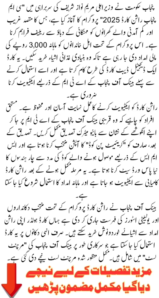 Ration Card Activation Method: The Government of Punjab has launched the CM Punjab Ration Card 2025 program under the leadership of Chief Minister Maryam Nawaz Sharif. This initiative aims to support low-income families struggling to afford basic food items amid increasing prices. Eligible households receive Rs. 3,000 monthly assistance, which can be used to buy groceries from authorized utility stores and karyana merchants. The digital smart card works like a debit card and must be activated through the Bank of Punjab ATM before use.