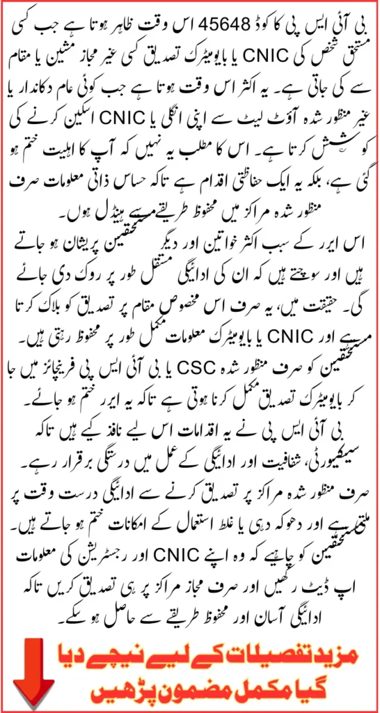 BISP Error Code 45648 occurs when a beneficiary’s CNIC or biometric verification fails at an unauthorized location or device. This often happens when someone tries to verify their fingerprint or CNIC at a regular retailer machine or any outlet not approved by BISP or NADRA.
