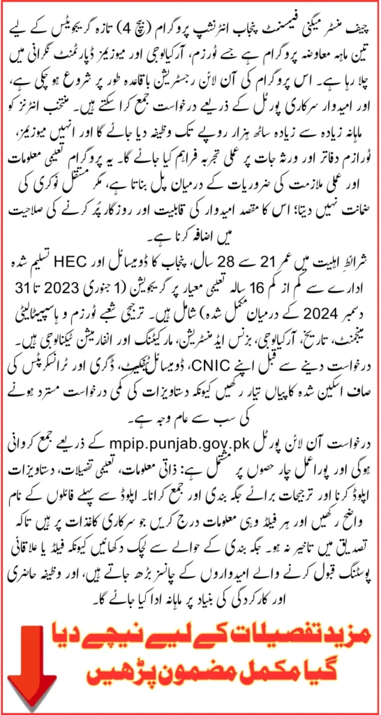 The program targets graduates from relevant fields, offers placements at museums and tourism offices across the province, and pays a monthly stipend of up to Rs 60,000. Applicants must apply via the official portal mpip.punjab.gov.pk and follow the step-by-step online process described below.