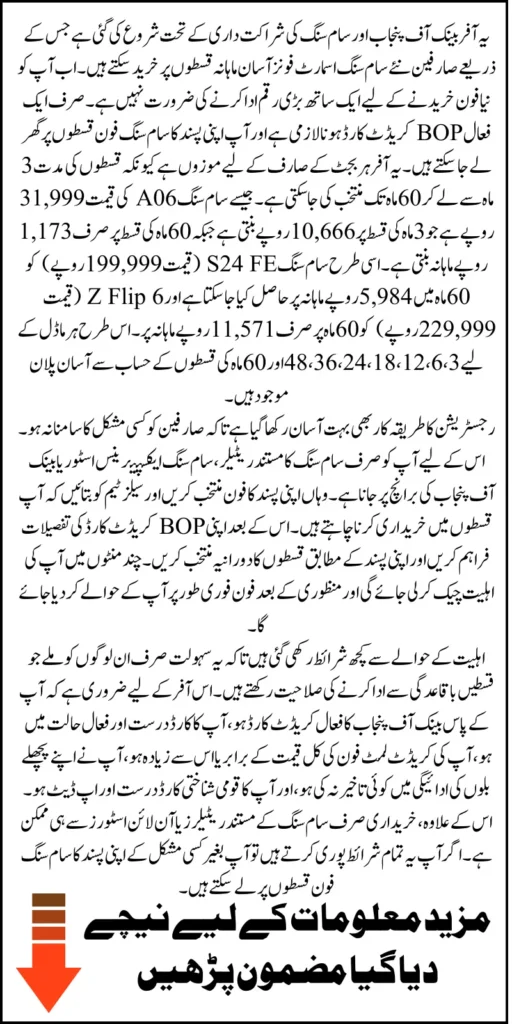 Samsung Mobile On Easy Installment By BOP Credit Card: Bank of Punjab is now offering an easy way to buy brand-new Samsung smartphones through monthly installments. This means you can get even the most expensive Samsung phones without paying the full price at once. All you need is a valid BOP Credit Card, and you can take home your favorite Samsung model while spreading the cost over months, making it affordable and convenient.