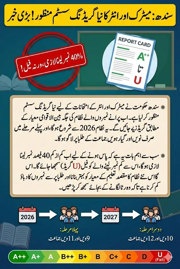 New Grading System for Matric and Intermediate Exams: The Sindh Government has officially approved a new grading system for Matric (SSC) and Intermediate (HSSC) examinations, which will be implemented from 2026. According to the Provincial Minister for Universities, Ismail Rahoo, the policy mandates that students scoring less than 40 percent will be considered fail. This decision marks a significant shift from the traditional marks-based evaluation system to a modern grading framework aligned with international standards.